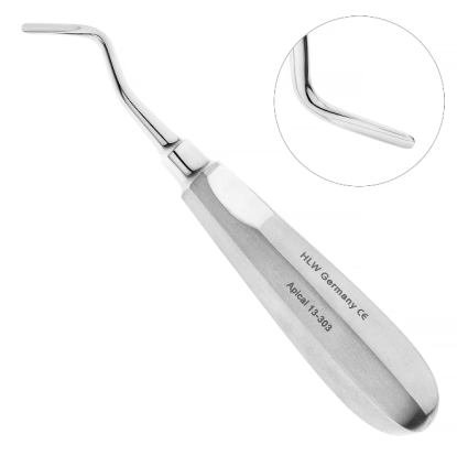 Применяется при удалении корней зубов, особенно в сложных случаях, когда требуется аккуратная люксация. Позволяет работать в узких межкорневых пространствах, минимизируя травматизацию окружающих тканей.